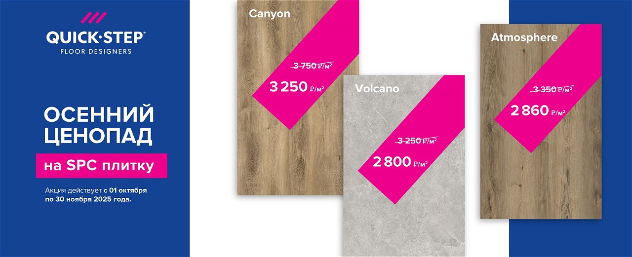 Предоставляются скидки на SPC бренда Quick-Step от 14 до 15% (в зависимости от коллекции).